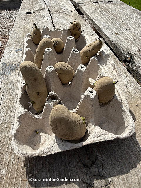 We first put our 9 ‘Russian Banana’ seed potatoes through the “chitting” method. This involves placing them into a container in a bright area indoors to allow them to start sprouting. Empty egg cartons work great for this! Taking about a month, the chitting process gives the plants a head start at planting time. In the photo to the left, you can see the little sprouts on each potato.