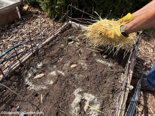 In Bill’s half, the soil was about an inch below the lip of the raised bed. He placed “his” 5 seed potatoes there. You’ll notice in the photo to the left that he created a little “fence” around that area, using apple branches. That made a barrier to help keep the straw in place.