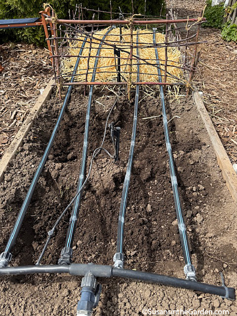 Each time those potatoes start to sprout through the straw, Bill intends to keep adding more straw. In the photo at the bottom, you can see what the whole bed looks like at this point. Our drip irrigation system is running down the length of the bed.